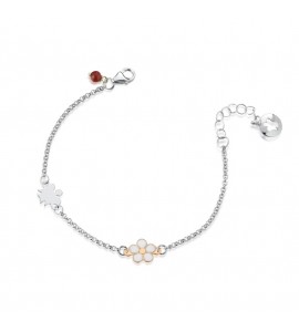 Bracciale bimba in oro bianco con angelo e fiorellino in oro rosa e smalto bianco e corallo rosso charm.