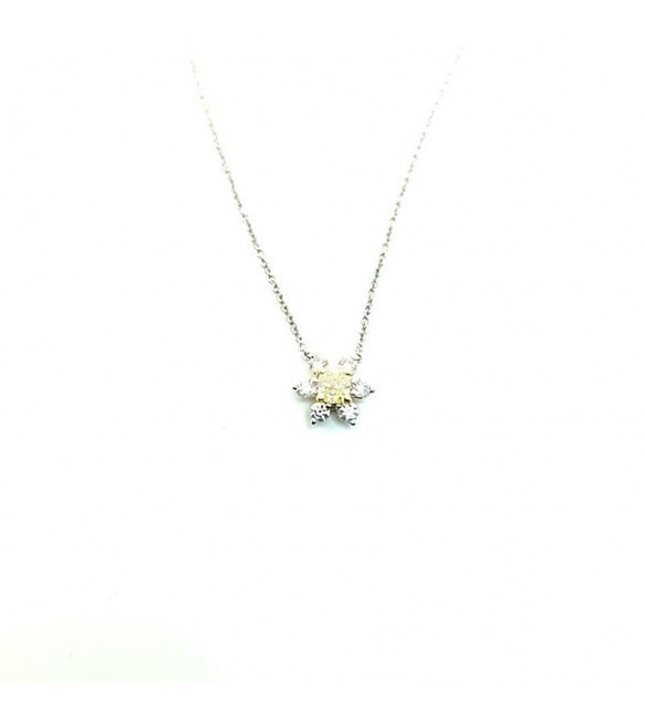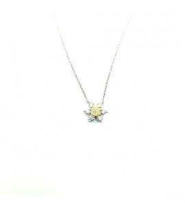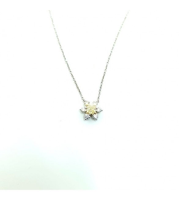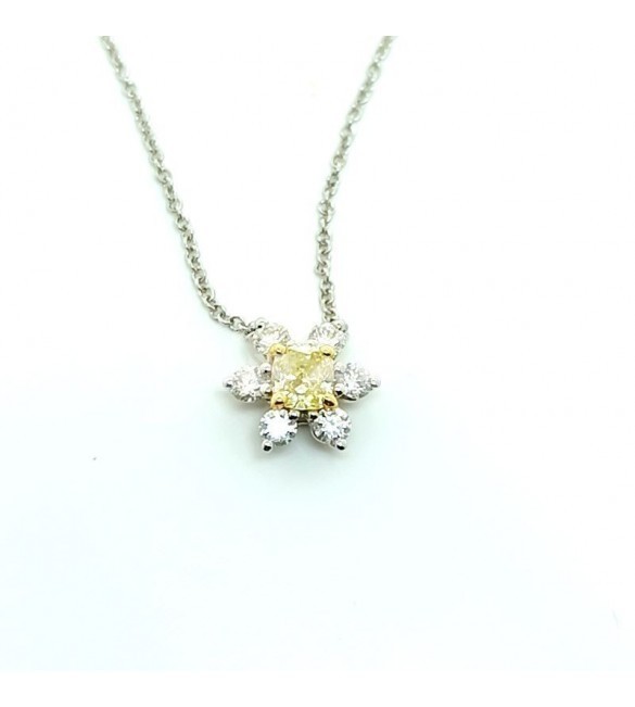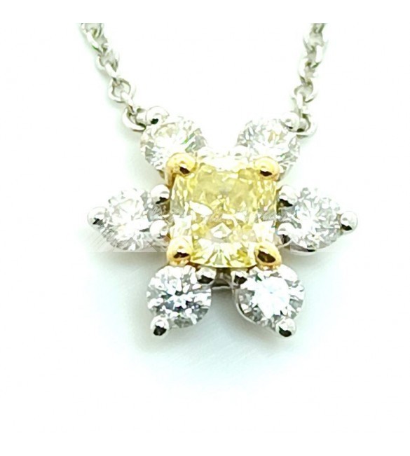 vende girocollo Tiffany Buttercup in platino 950 e oro giallo 750, con un diamante centrale taglio cuscino, Fancy Yellow, purezza VVS1, peso carati 0.34, provenienza Botswana Sort con sei diamanti taglio brillante, colore G-J, purezza IF-SI1, peso totale carati 0.27.