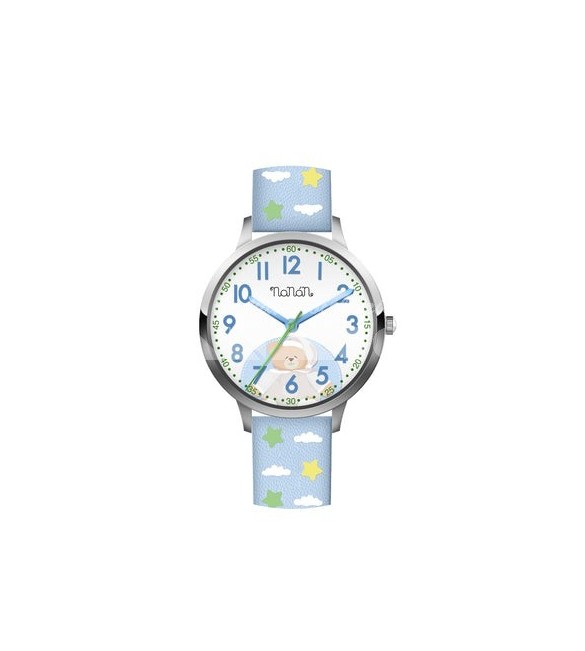 L'orologio Nanan è la scelta ideale per aiutare il tuo bambino ad imparare a leggere l'ora grazie alle sue lancette facili ed intuitive. Lo accompagna nella giornata il dolcissimo orsetto Tato posto all'interno del quadrante.